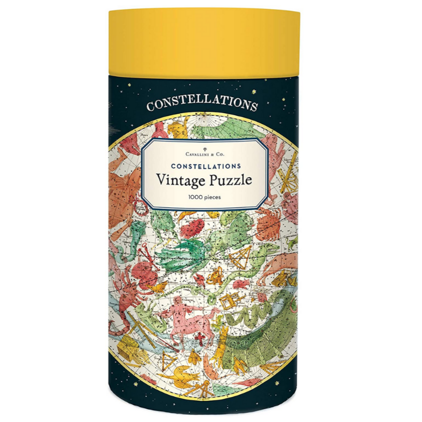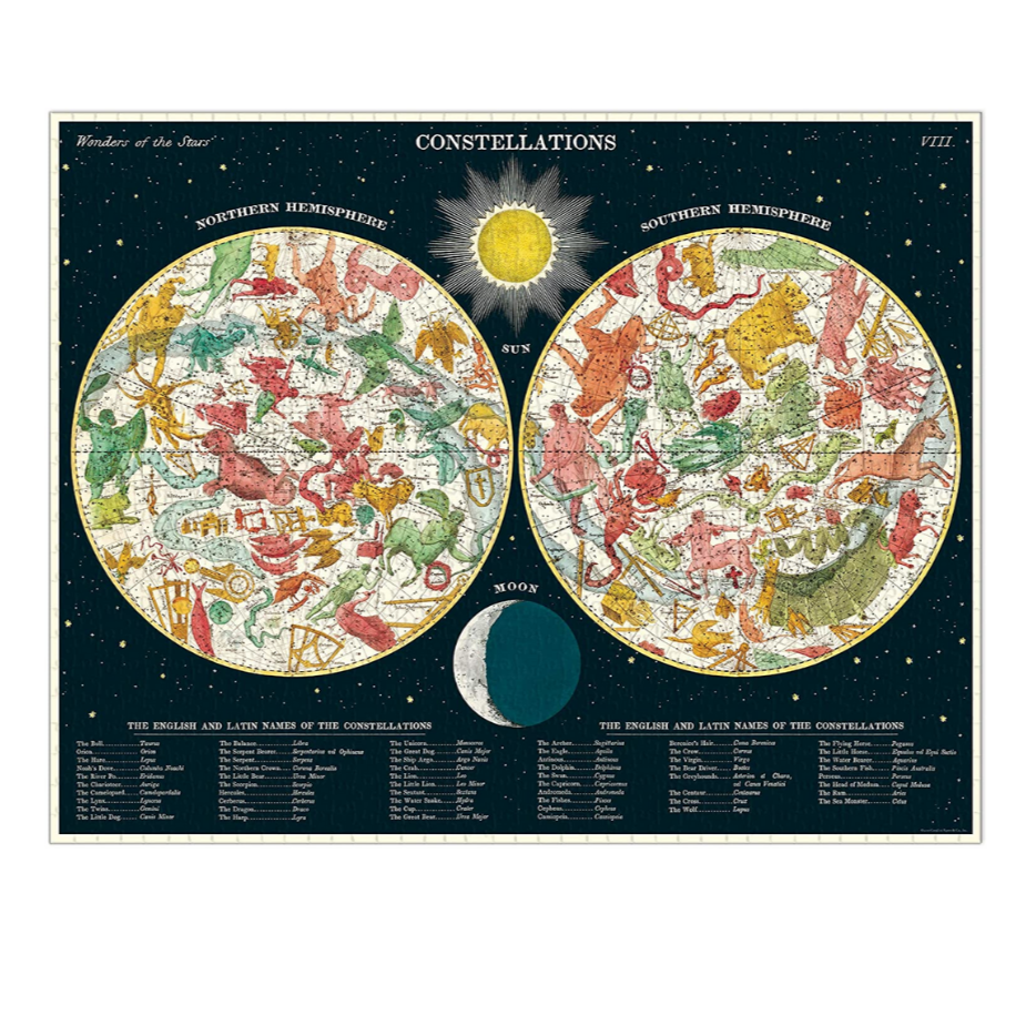 This beautiful 1000 piece jigsaw puzzle features Cavallini’s Constellations - Wonders of the Stars art. The puzzle is packaged in a 10 inch long cardboard tube, with puzzle pieces safely stored in a muslin bag inside. Finished puzzle measures 22 by 28 inches.