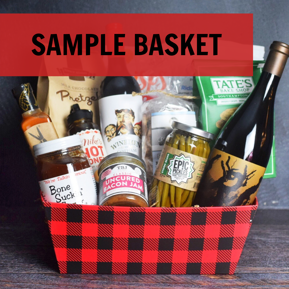 Price includes basket, cellophane wrap, filler, gift tag, ribbon, and professional assembly. Products are not included.