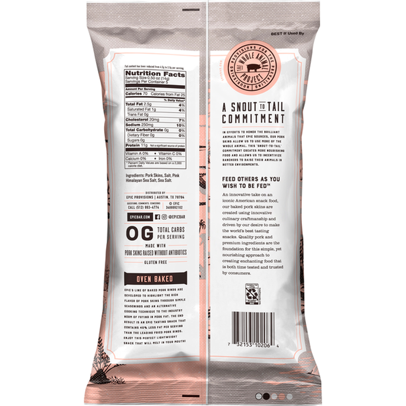 Satisfy your crunch craving when you reach for a bag for your next snack, lunch or as a breading alternative. The Pink Himalayan & Sea Salt Baked Pork Rinds are made with pork skins, pink Himalayan salt, and sea salt.