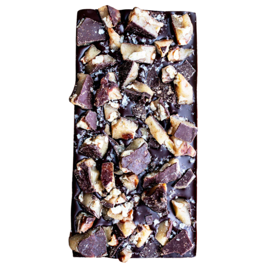 Inspired by time in Austin, Texas, this bar brings you a touch of the heartland with crunchy brown butter pecan brittle covering rich 70% dark chocolate.