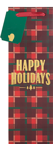 Conjure the ambiance of warm cabins, roaring fires and steaming hot chocolate with our "Plaid Happy Holidays" wine bag! This toasty nod to cold weather and warm wear comes bedecked in a green and red-checkered pattern, with gold-foiled lettering proclaiming tidings of joy for the holiday season. Best paired with a gracious bottle of wine and good company.