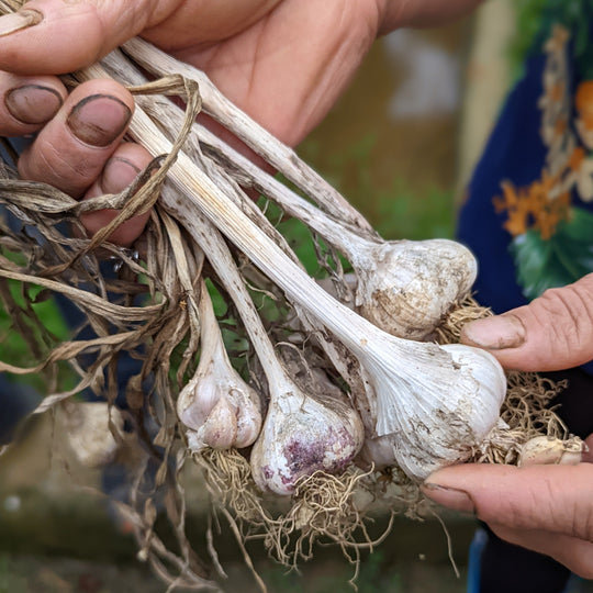 This is an heirloom variety with a purple stripe on its papery skin and small bulbs.